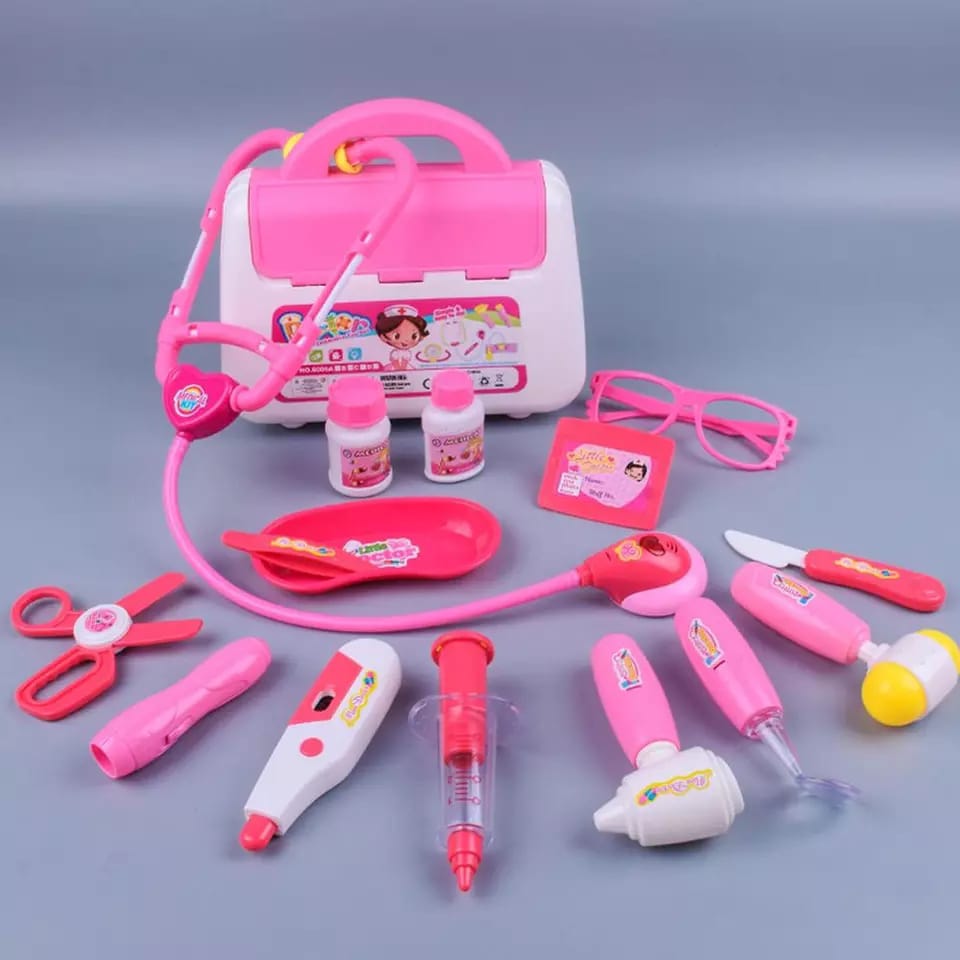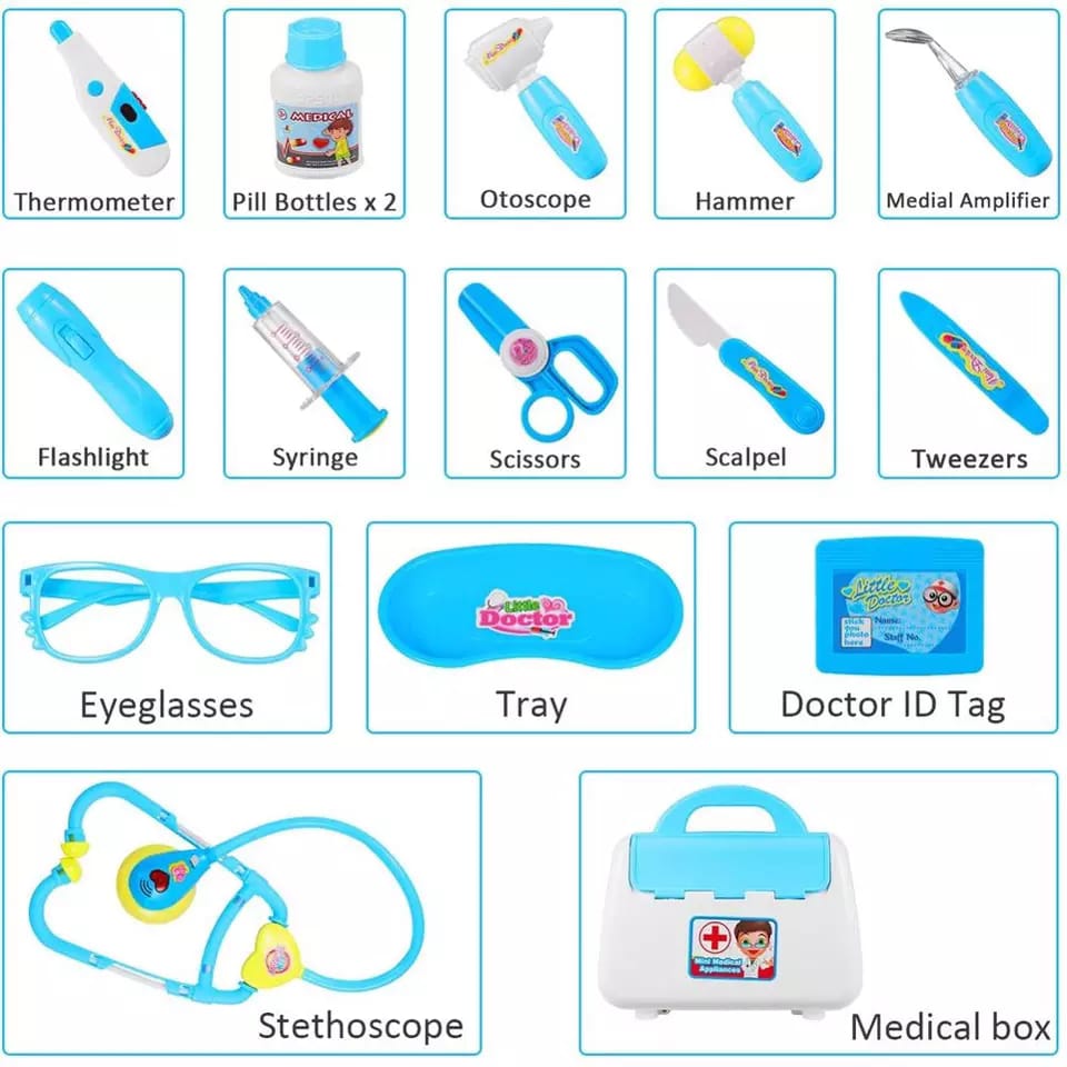 17pcs/ set Children Medical Playset ? Doctor’s pretend Kit for Kids ? Mini Pretend and Play Medical Toys Set ? Age:3yrs up Package includes: ✓ Doctor’s Work permit ✓ Operation panel ✓ Stethoscope ✓ Thermometer ✓ Medicine bottle x2 ✓ Injection syringe ✓ Scalpel ✓ Scissors ✓ Eyeglasses ✓ Tray ✓ Medical Amplifier ✓ Flashlight ✓ Medical too box
